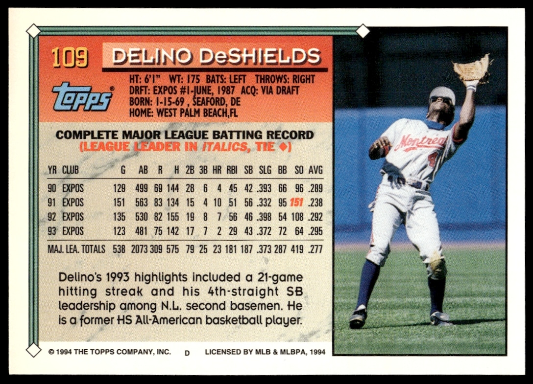 This BaseballΒ card, from 1994 is part of the Topps GoldΒ card set. Delino DeShields is featured and has a card number of 109.