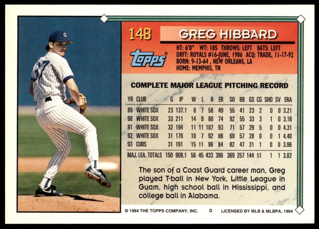 This Baseball card, from 1994 is part of the Topps Gold card set. Greg Hibbard is featured and has a card number of 148.