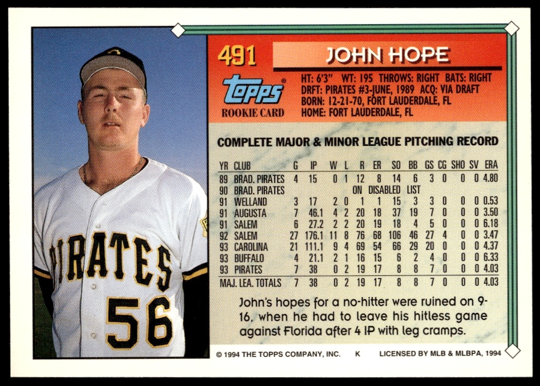 This Baseball card, from 1994 is part of the Topps Gold card set. John Hope is featured and has a card number of 491.