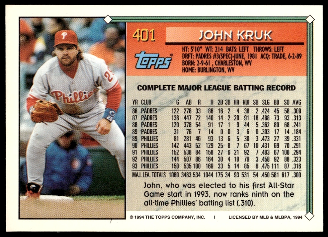 This Baseball card, from 1994 is part of the Topps Gold card set. John Kruk is featured and has a card number of 401.