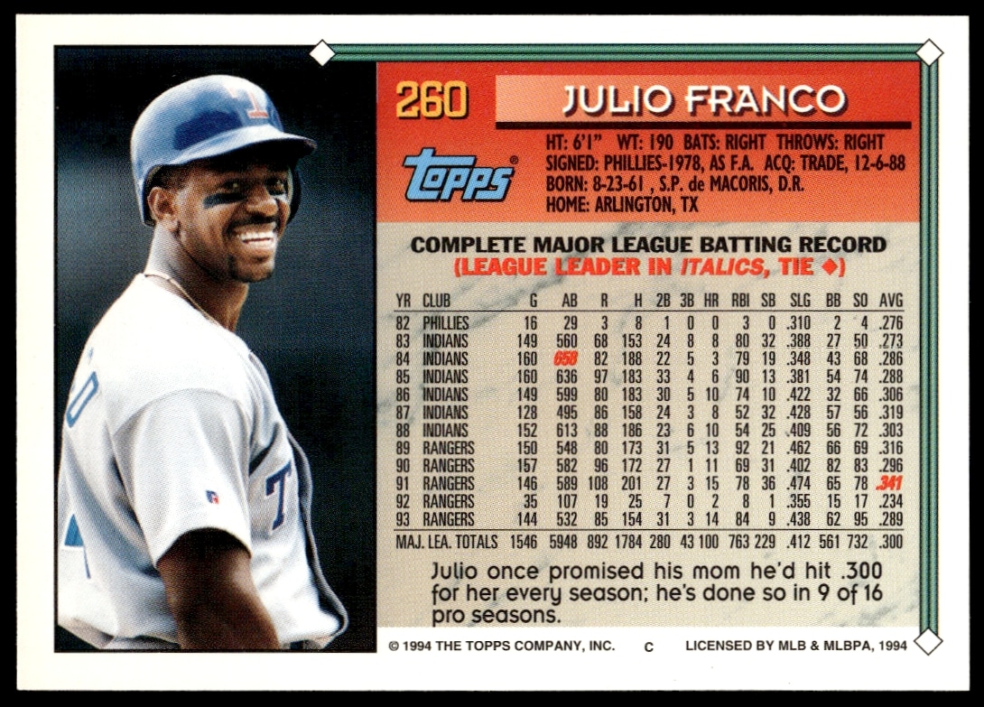 This Baseball card, from 1994 is part of the Topps Gold card set. Julio Franco is featured and has a card number of 260.