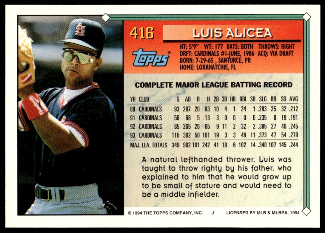 This Baseball card, from 1994 is part of the Topps Gold card set. Luis Alicea is featured and has a card number of 416.