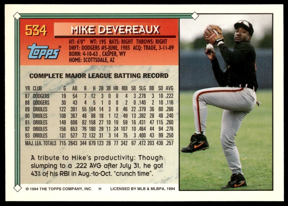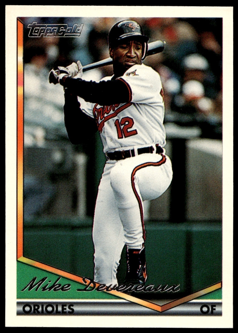 This BaseballΒ card, from 1994 is part of the Topps GoldΒ card set. Mike Devereaux is featured and has a card number of 534.