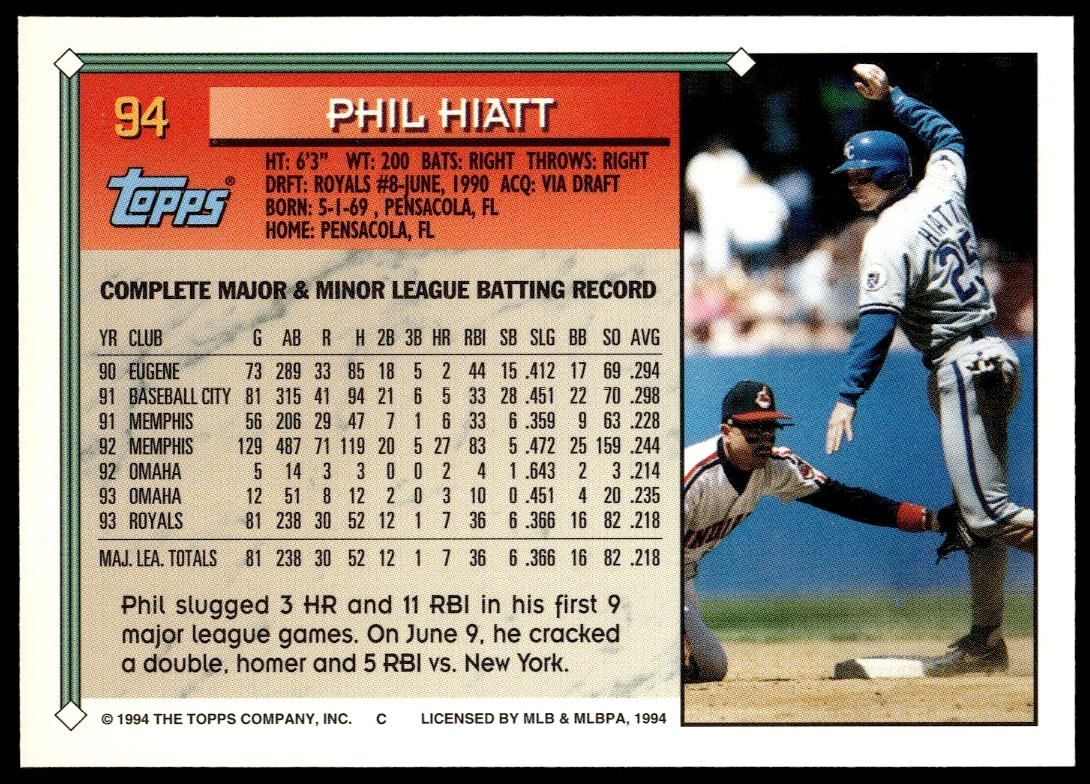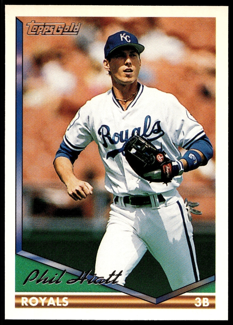 This Baseball card, from 1994 is part of the Topps Gold card set. Phil Hiatt is featured and has a card number of 94.