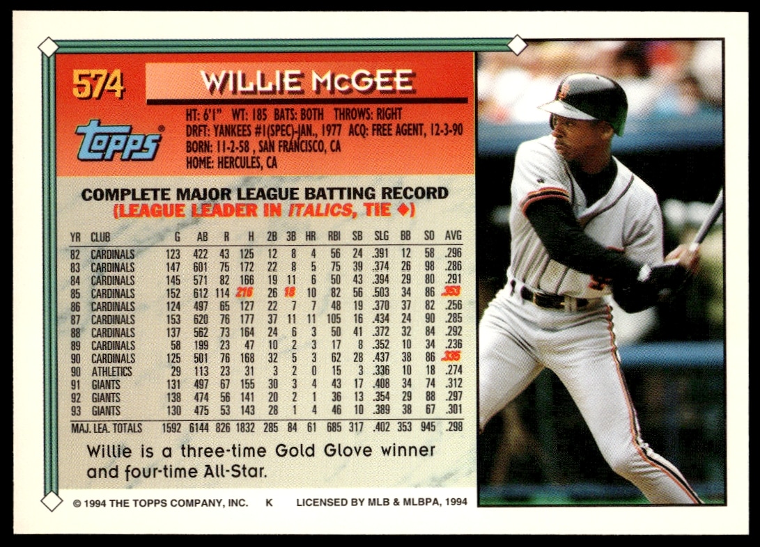 This BaseballΒ card, from 1994 is part of the Topps GoldΒ card set. Willie McGee is featured and has a card number of 574.
