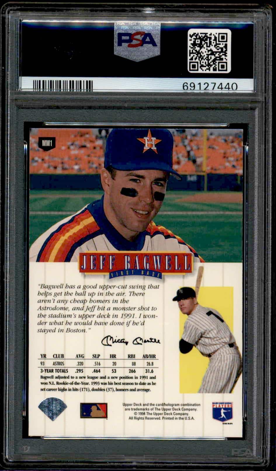 This Baseball card, from 1994 is part of the Upper Deck Mickey Mantle card set. Jeff Bagwell is featured and has a card number of MM1. It is graded by PSA and has a numeric grade of 8.