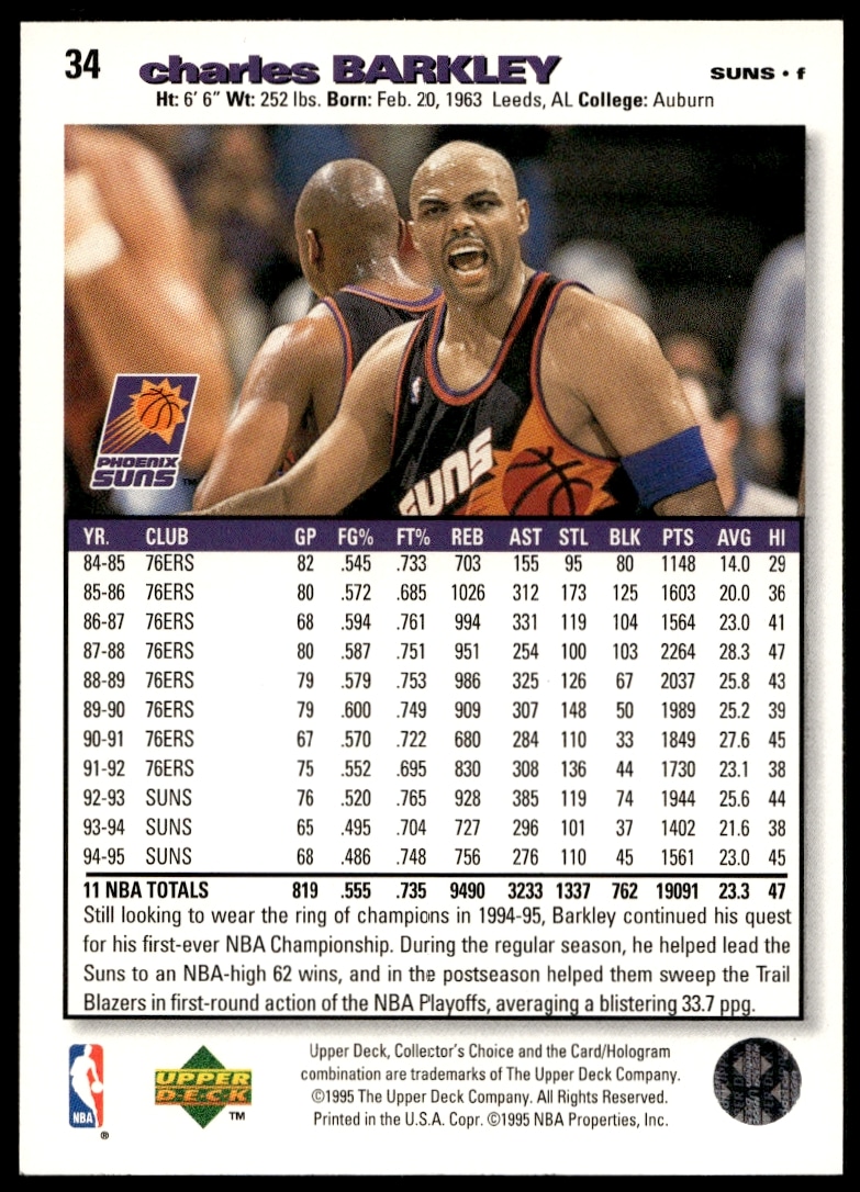 This Basketball card, from 1995-96 is part of the Upper Deck Collector’s Choice card set. Charles Barkley is featured and has a card number of 121.