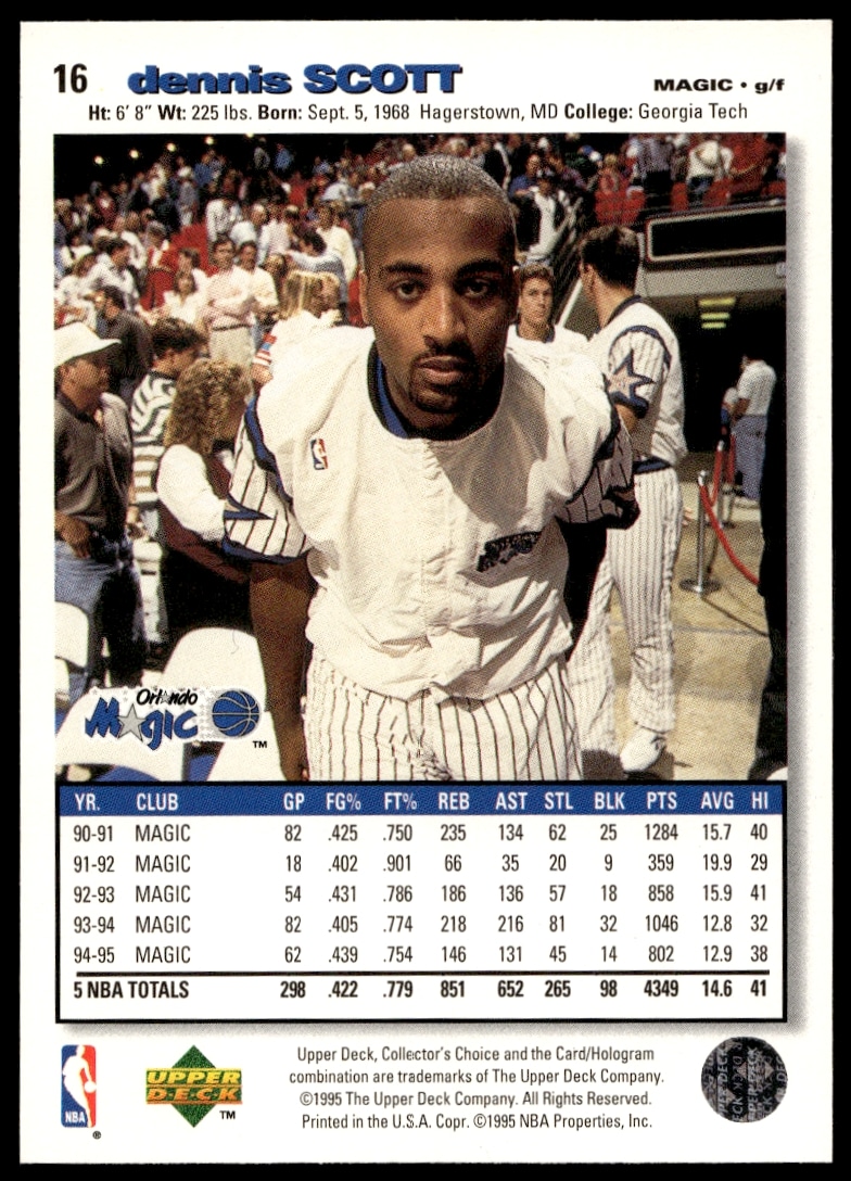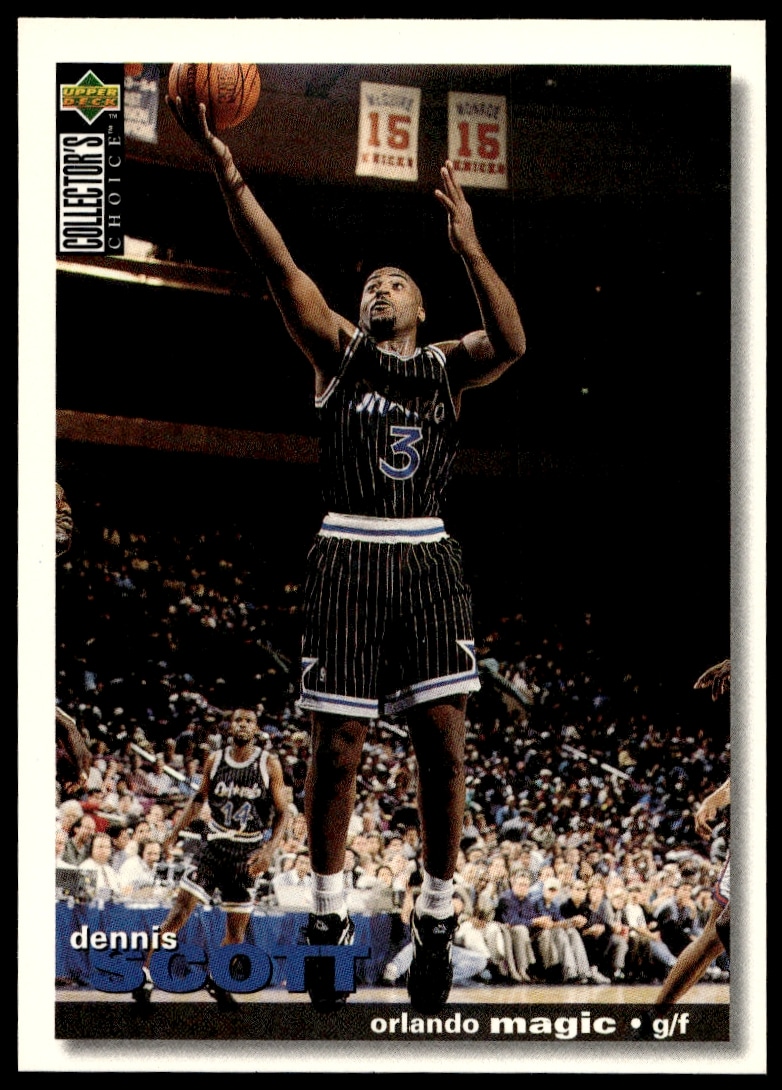 This Basketball card, from 1995-96 is part of the Upper Deck Collector’s Choice card set. Dennis Scott is featured and has a card number of 109.