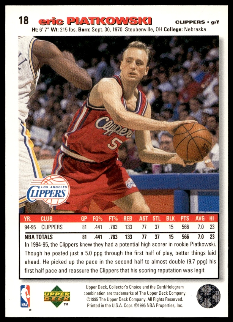This Basketball card, from 1995-96 is part of the Upper Deck Collector’s Choice card set. Eric Piatkowski is featured and has a card number of 18.