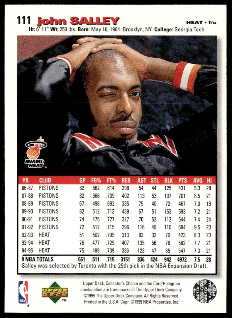 This Basketball card, from 1995-96 is part of the Upper Deck Collector’s Choice card set. John Salley is featured and has a card number of 111.