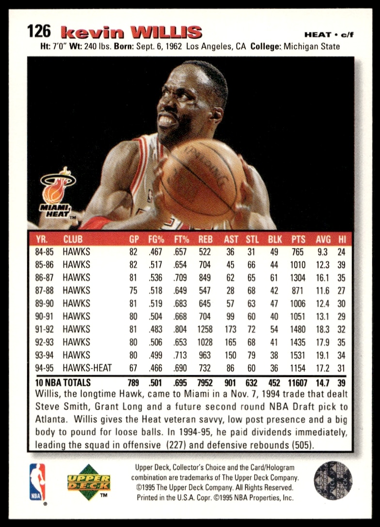 This Basketball card, from 1995-96 is part of the Upper Deck Collector’s Choice card set. Kevin Willis is featured and has a card number of 83.