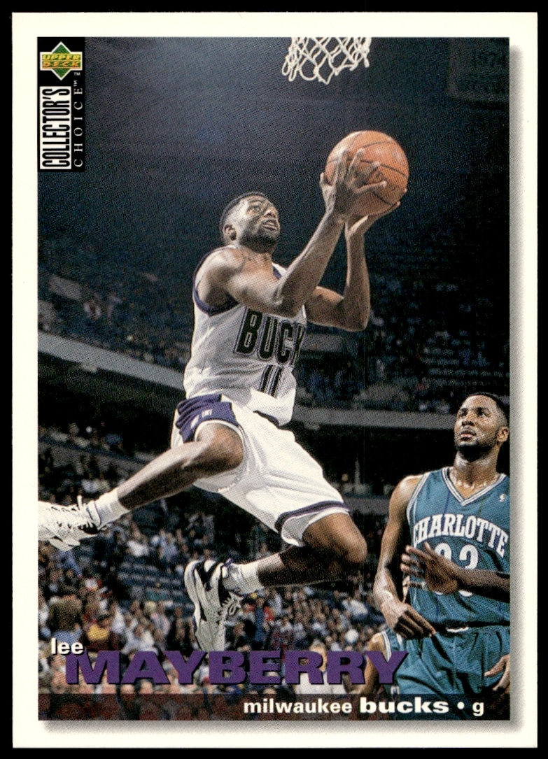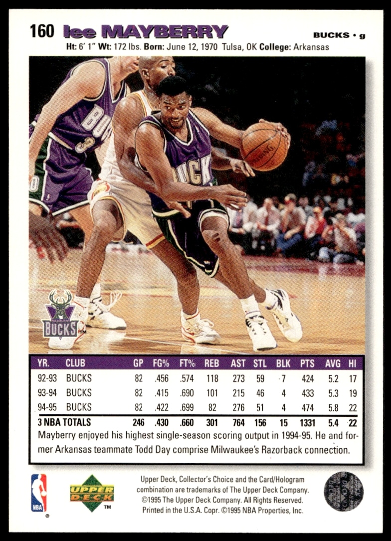 This Basketball card, from 1995-96 is part of the Upper Deck Collector’s Choice card set. Lee Mayberry is featured and has a card number of 160.