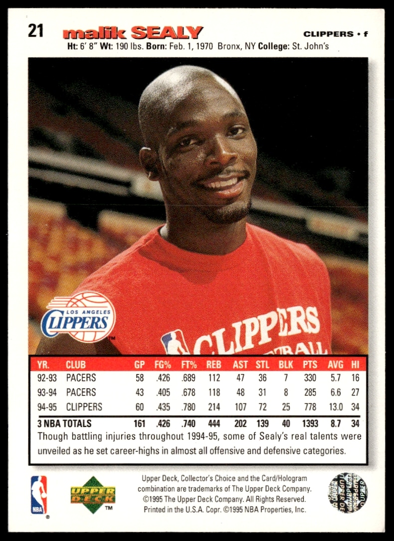 This Basketball card, from 1995-96 is part of the Upper Deck Collector’s Choice card set. Malik Sealy is featured and has a card number of 21.