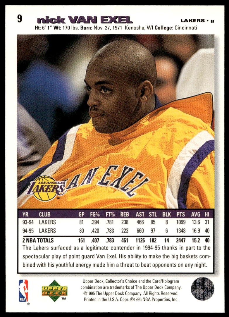 This Basketball card, from 1995-96 is part of the Upper Deck Collector’s Choice card set. Nick Van Exel is featured and has a card number of 9.