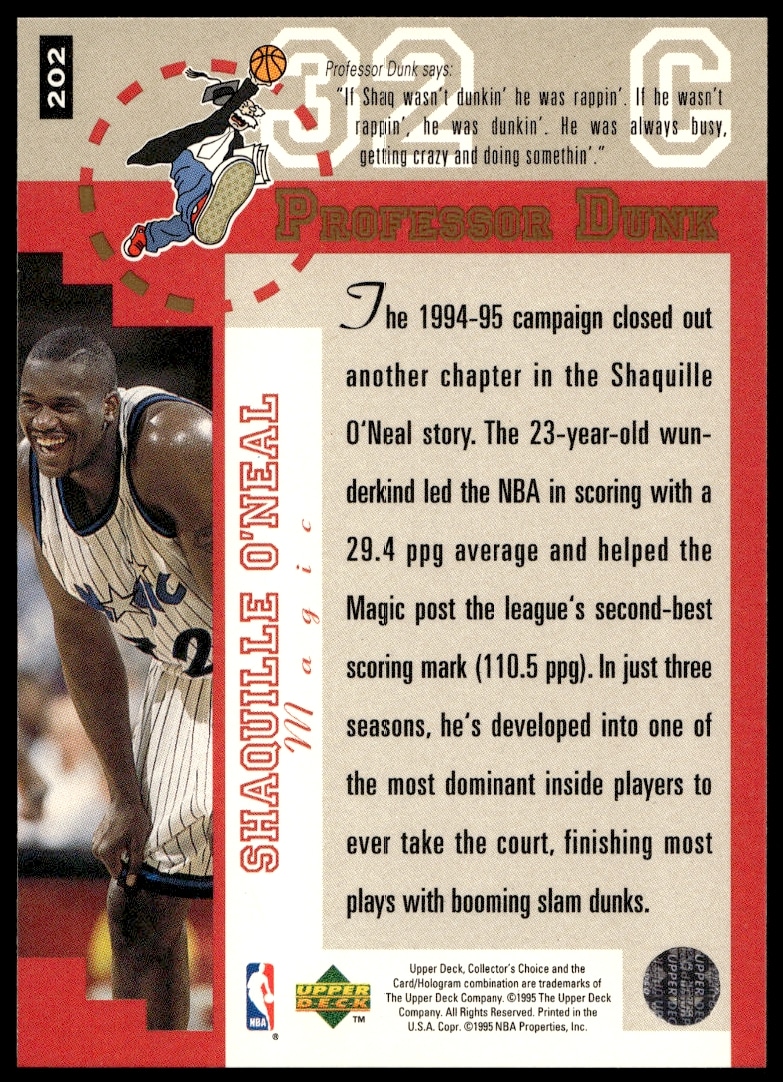 This Basketball card, from 1995-96 is part of the Upper Deck Collector’s Choice card set. Shaquille O’Neal is featured and has a card number of 202.