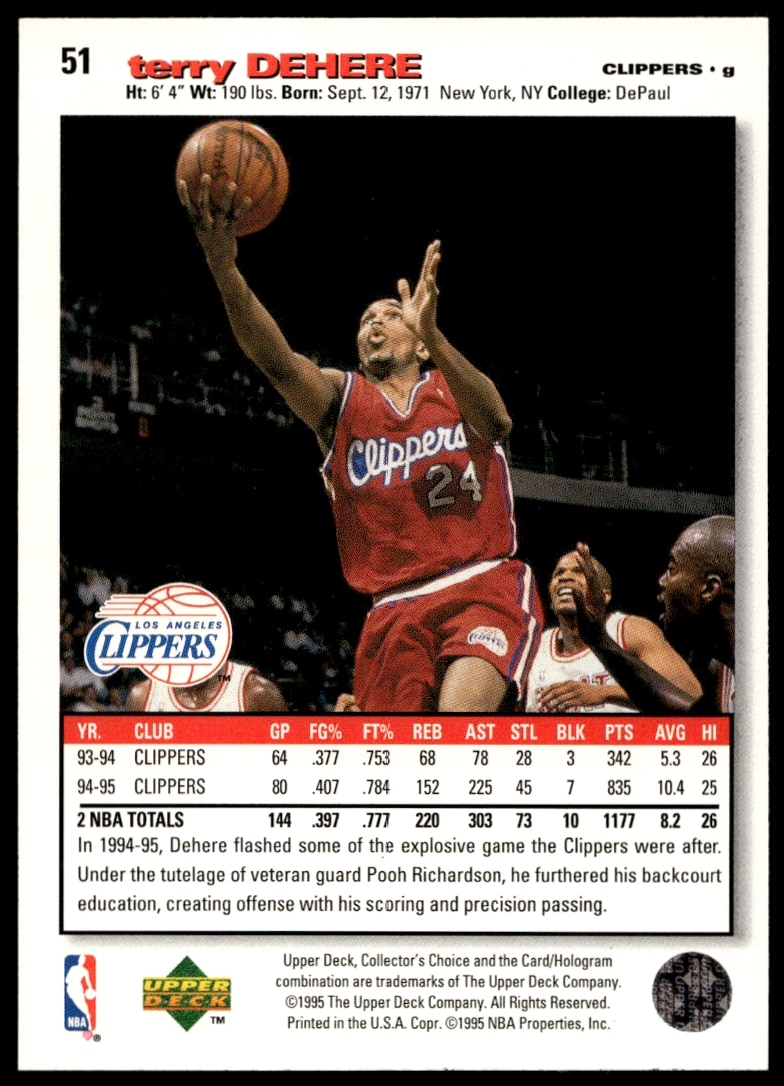 This Basketball card, from 1995-96 is part of the Upper Deck Collector’s Choice card set. Terry Dehere is featured and has a card number of 51.