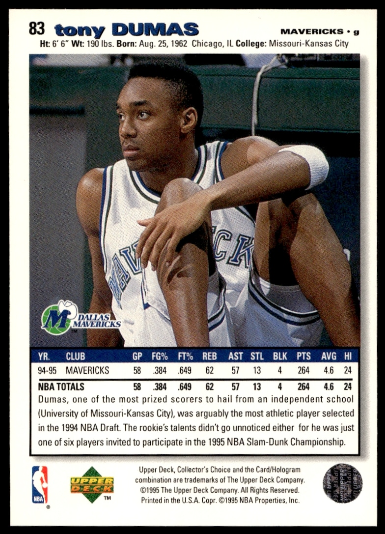 This Basketball card, from 1995-96 is part of the Upper Deck Collector’s Choice card set. Tony Dumas is featured and has a card number of 83.