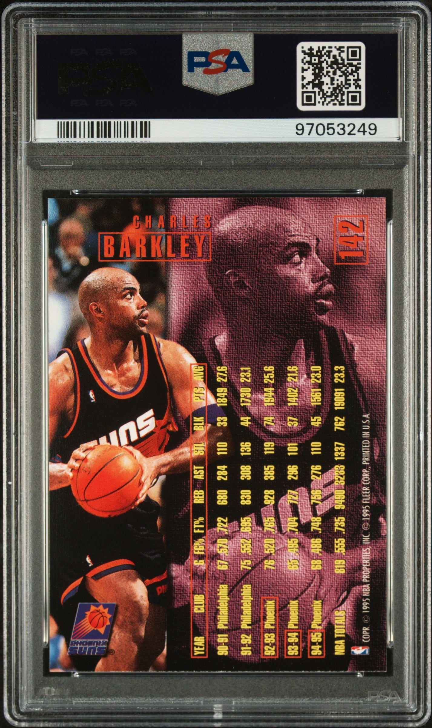 Own a graded 1995 Fleer Charles Barkley #142 basketball card in PSA 9 condition, perfect for collectors seeking quality and authenticity.