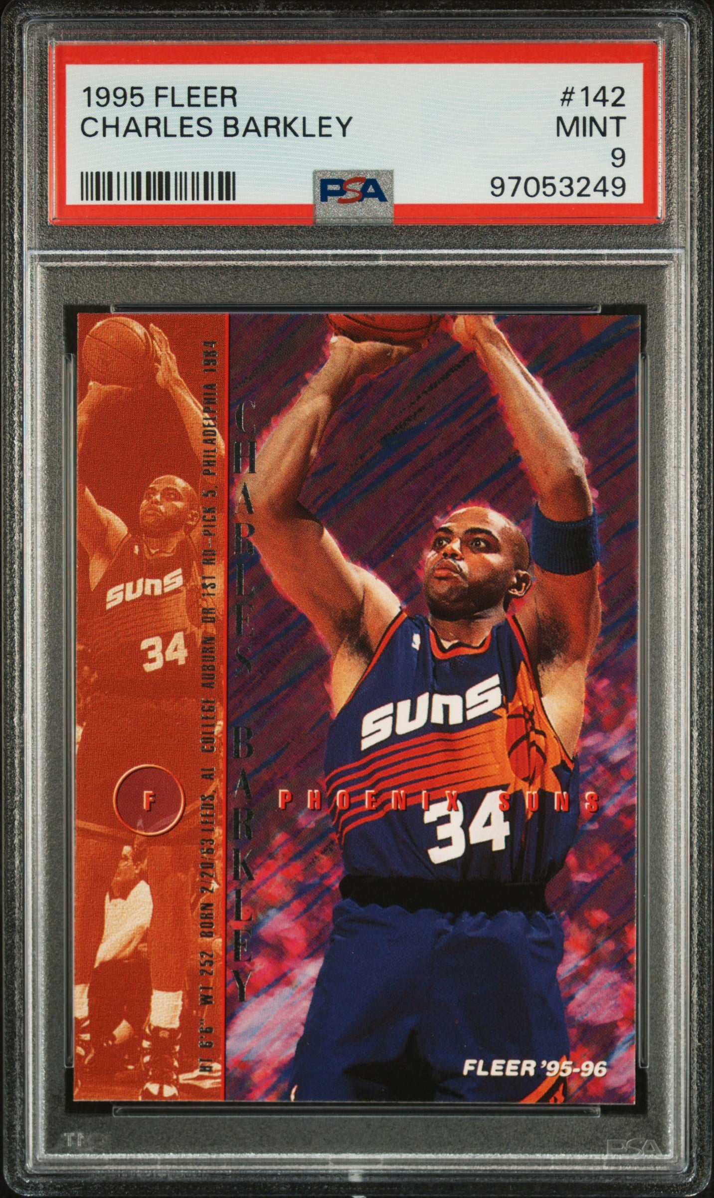This Basketball card, from 1995 is part of the Fleer card set. Charles Barkley is featured and has a card number of 142. It is graded by PSA and has a numeric grade of 9.