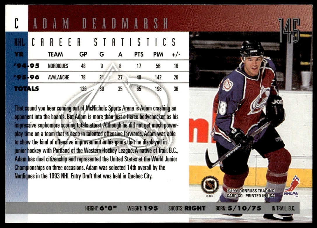 This Hockey card, from 1996-97 is part of the Donruss card set. Adam Deadmarsh is featured and has a card number of 145.