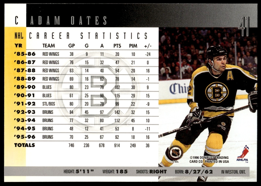 This Hockey card, from 1996-97 is part of the Donruss card set. Adam Oates is featured and has a card number of 41.