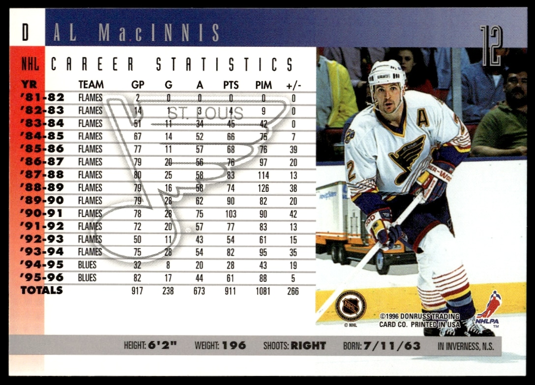 This Hockey card, from 1996-97 is part of the Donruss card set. Al MacInnis is featured and has a card number of 12.