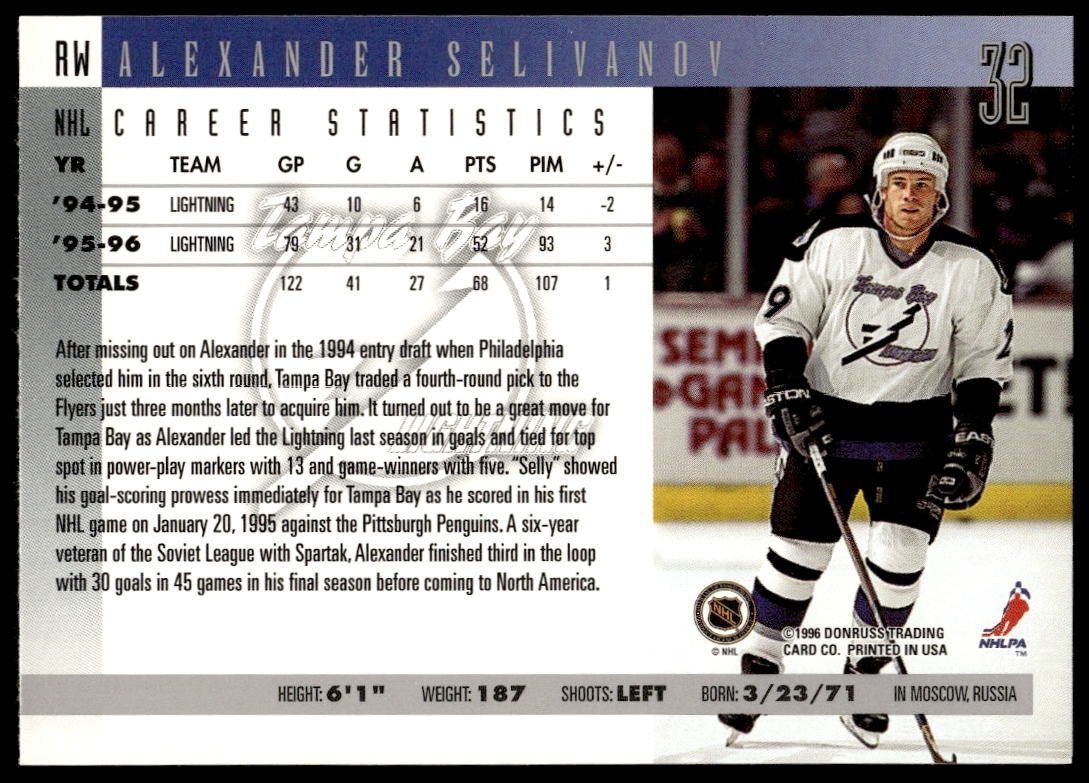 This Hockey card, from 1996-97 is part of the Donruss card set. Alexander Selivanov is featured and has a card number of 32.
