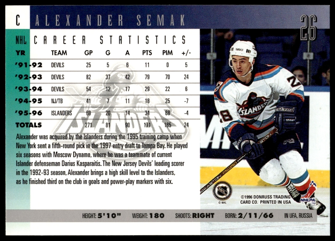 This Hockey card, from 1996-97 is part of the Donruss card set. Alexander Semak is featured and has a card number of 26.