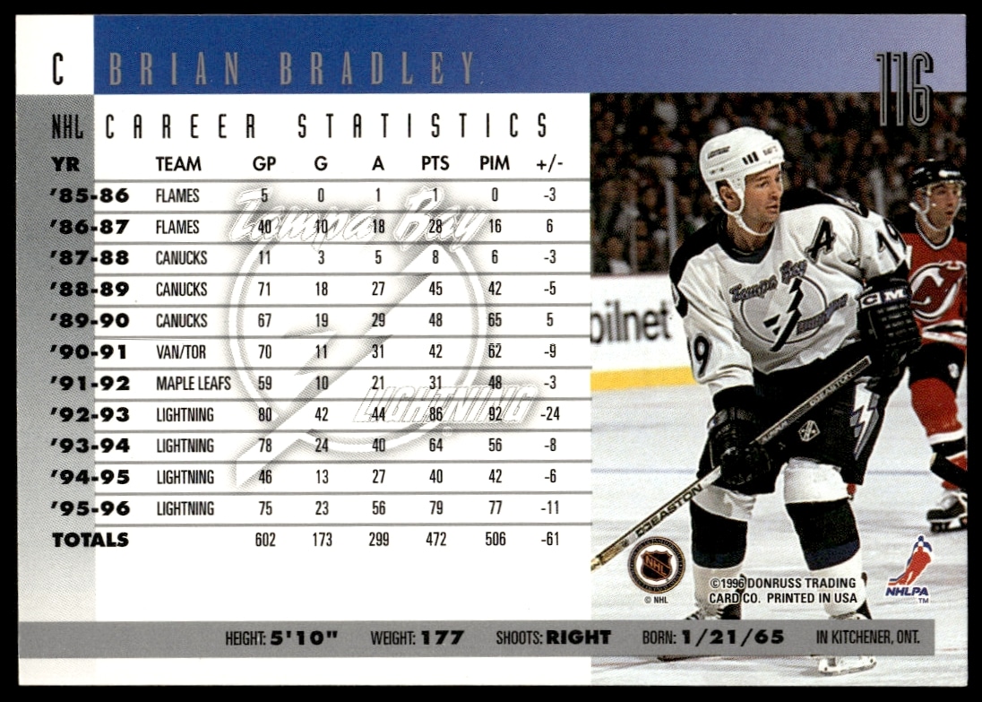 This Hockey card, from 1996-97 is part of the Donruss card set. Brian Bradley is featured and has a card number of 116.