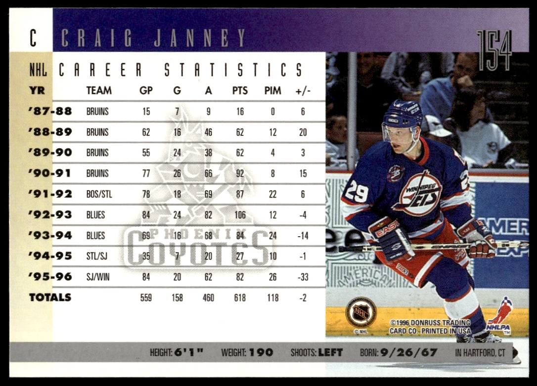 This Hockey card, from 1996-97 is part of the Donruss card set. Craig Janney is featured and has a card number of 154.