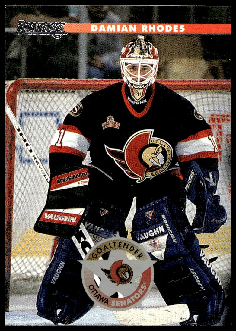 This Hockey card, from 1996-97 is part of the Donruss card set. Damian Rhodes is featured and has a card number of 156.