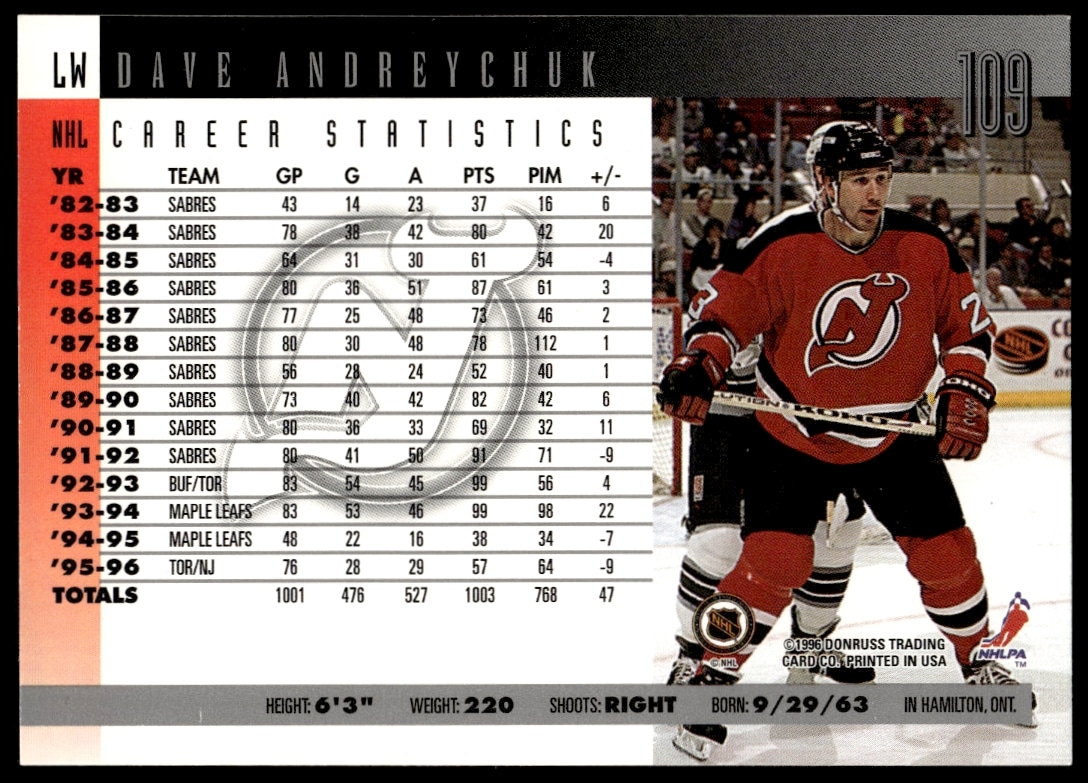This Hockey card, from 1996-97 is part of the Donruss card set. Dave Andreychuk is featured and has a card number of 109.