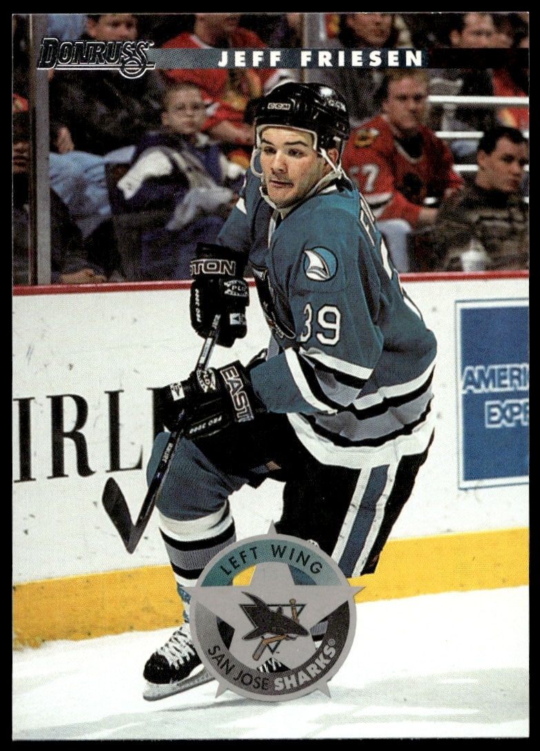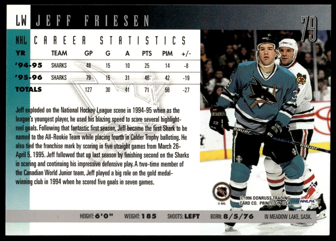 This Hockey card, from 1996-97 is part of the Donruss card set. Jeff Friesen is featured and has a card number of 79.
