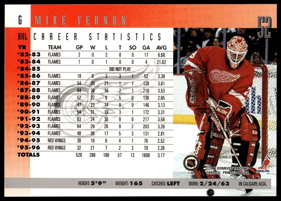 This Hockey card, from 1996-97 is part of the Donruss card set. Mike Vernon is featured and has a card number of 52.