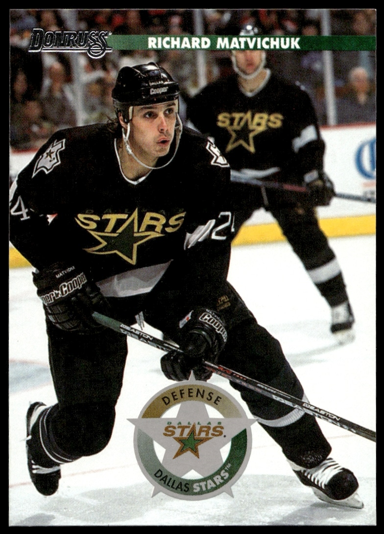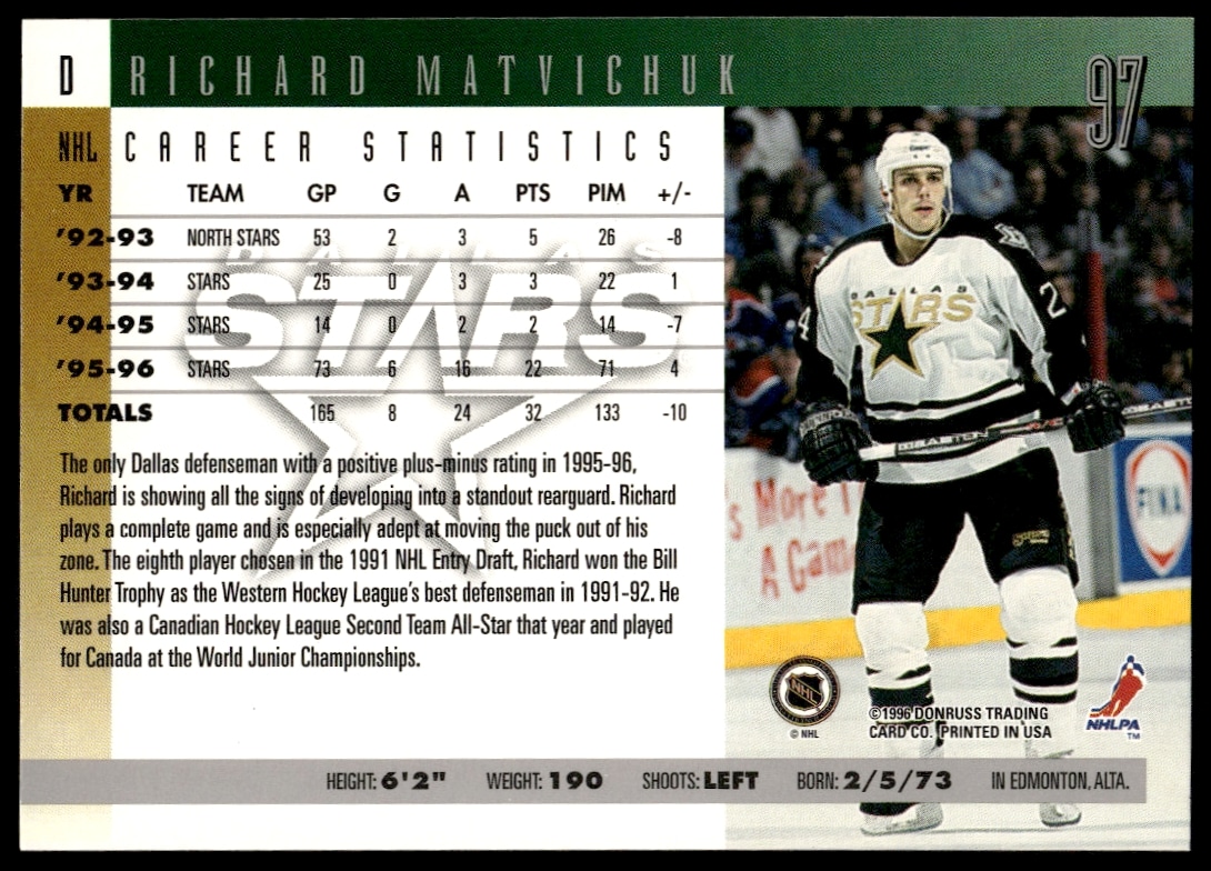 This Hockey card, from 1996-97 is part of the Donruss card set. Richard Matvichuk is featured and has a card number of 97.