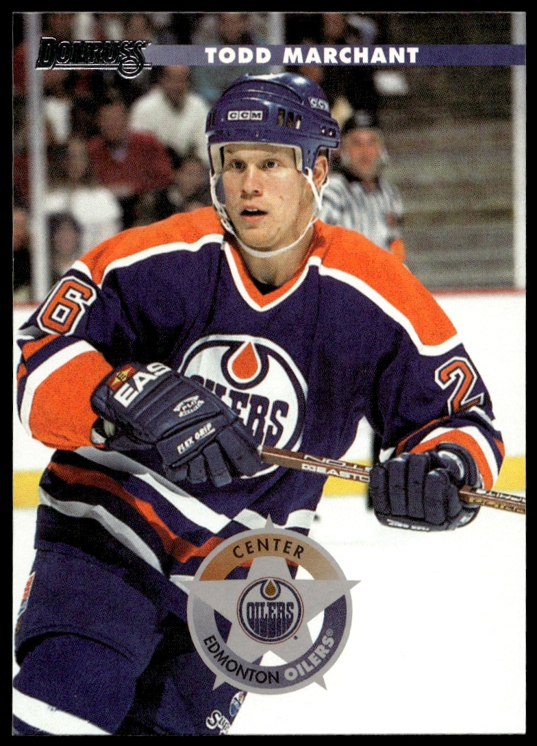 This Hockey card, from 1996-97 is part of the Donruss card set. Todd Marchant is featured and has a card number of 53.