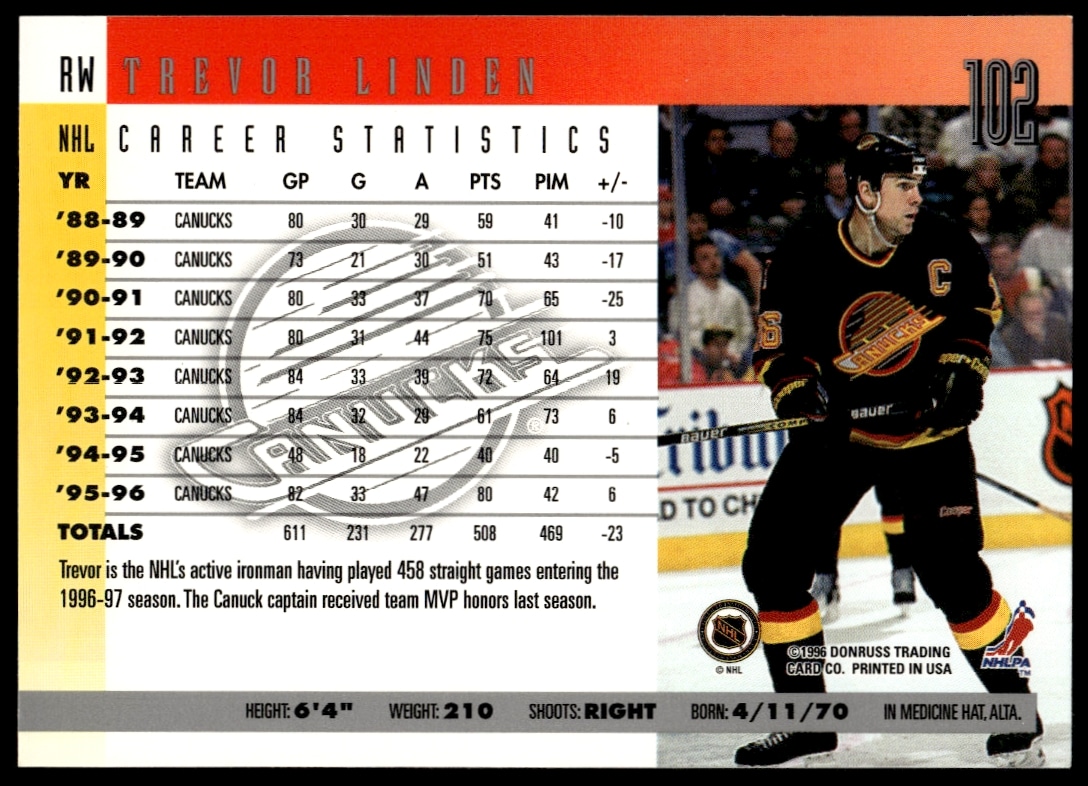 This Hockey card, from 1996-97 is part of the Donruss card set. Trevor Linden is featured and has a card number of 102.