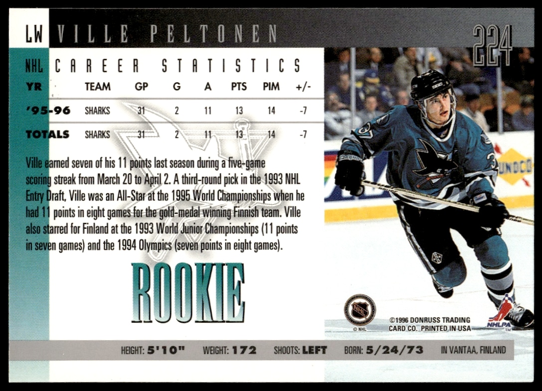 This Hockey card, from 1996-97 is part of the Donruss card set. Ville Peltonen is featured and has a card number of 224.