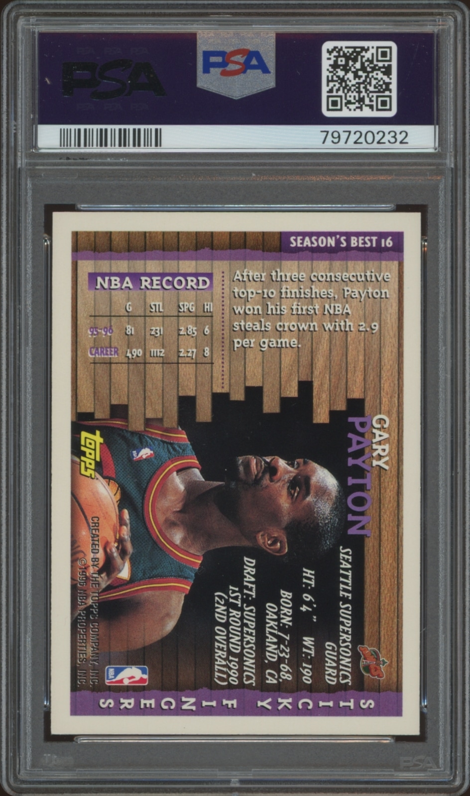 1996-97 Topps Gary Payton Season’s Best #16 card in PSA 9 condition, perfect for collectors and fans seeking a high-quality piece.