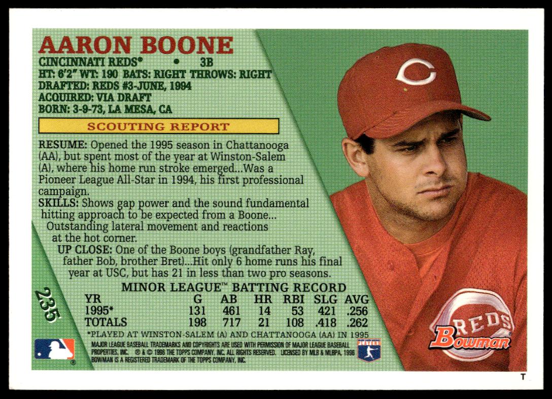 This Baseball card, from 1996 is part of the Bowman  card set. Aaron Boone is featured and has a card number of 235.