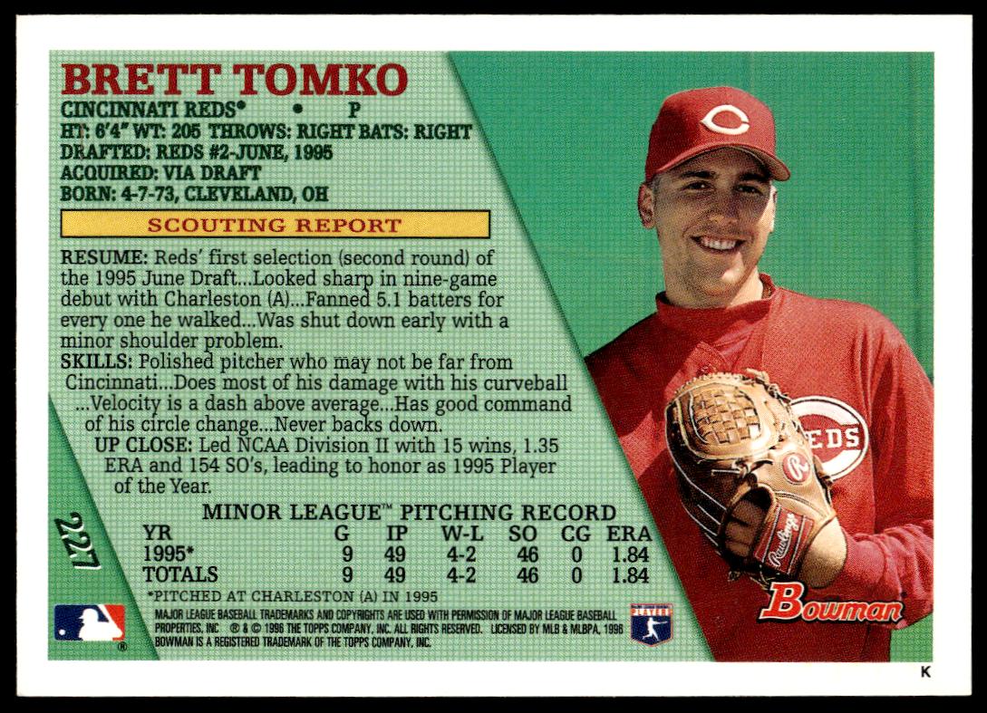 This Baseball card, from 1996 is part of the Bowman  card set. Brett Tomko is featured and has a card number of 227.