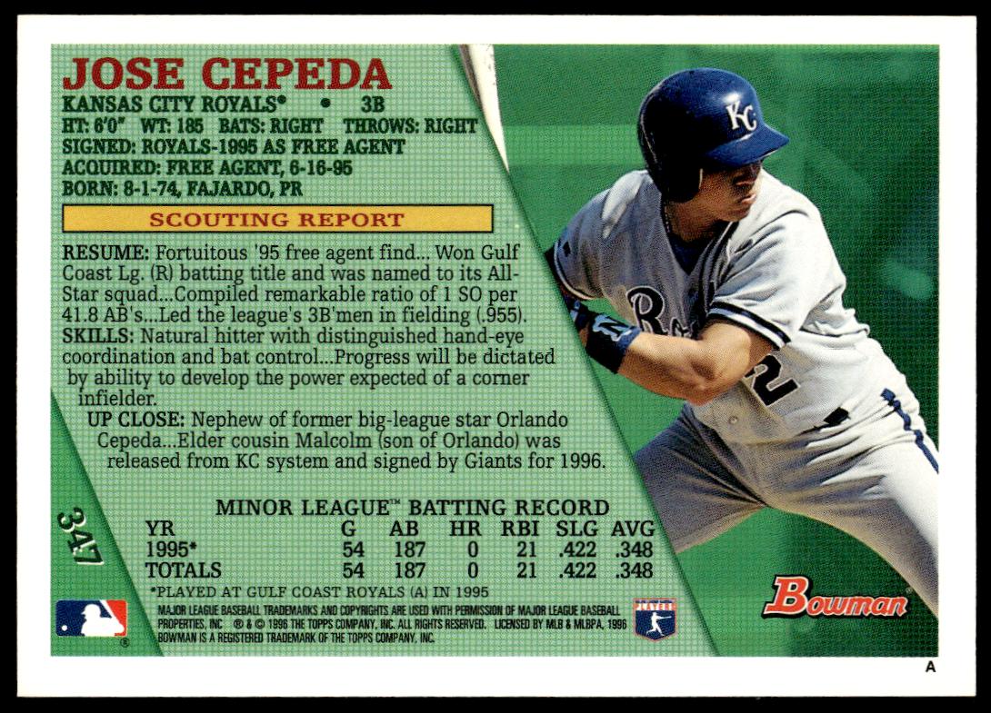 This Baseball card, from 1996 is part of the Bowman  card set. Jose Cepeda is featured and has a card number of 347.