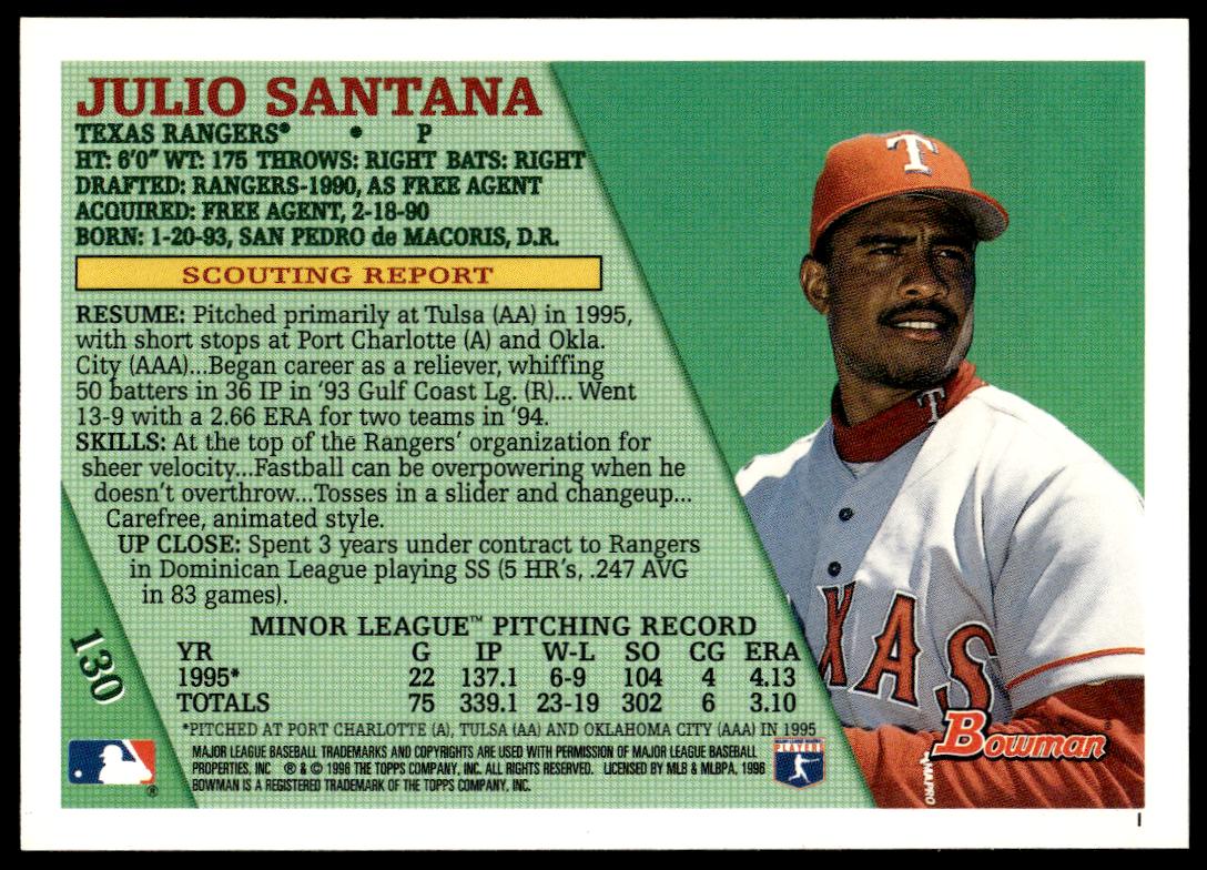 This Baseball card, from 1996 is part of the Bowman  card set. Julio Santana is featured and has a card number of 130.