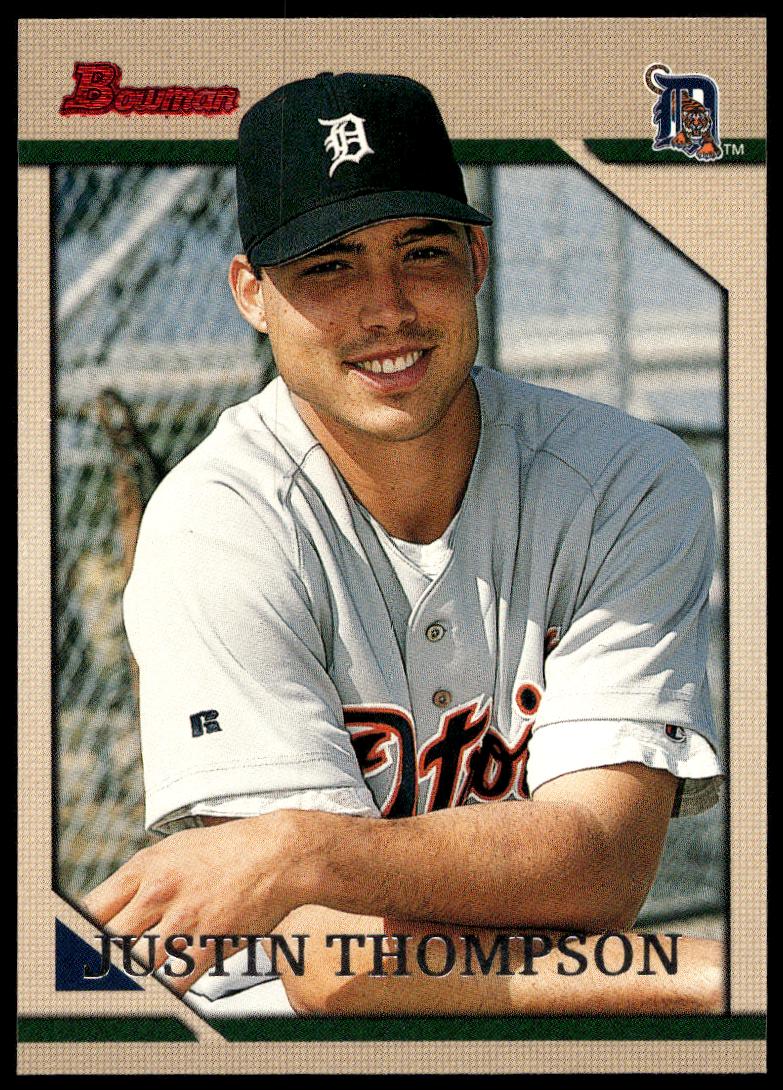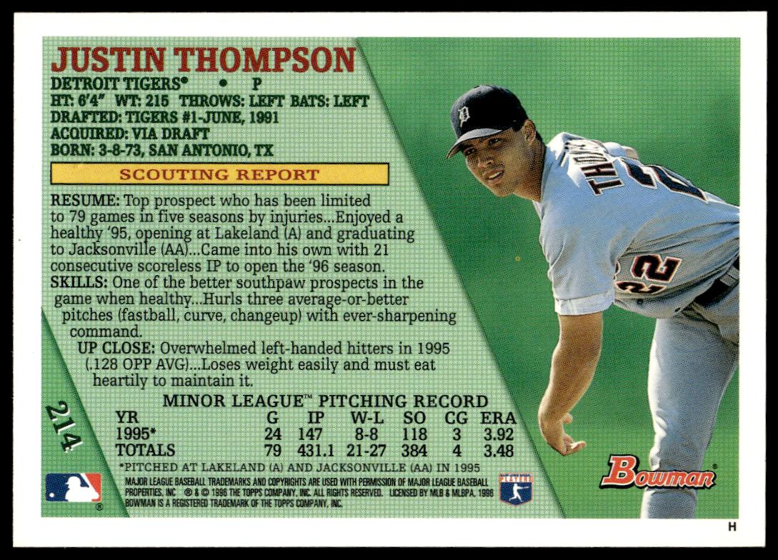 This Baseball card, from 1996 is part of the Bowman  card set. Justin Thompson is featured and has a card number of 214.