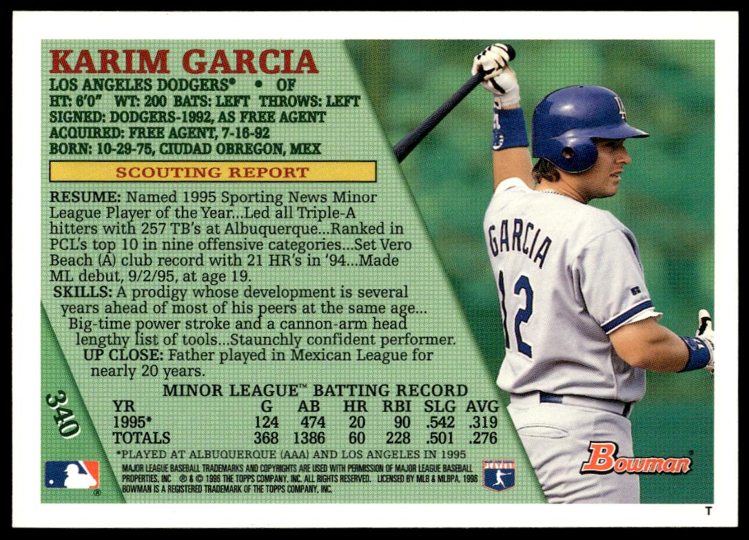 This Baseball card, from 1996 is part of the Bowman  card set. Karim Garcia is featured and has a card number of 340.
