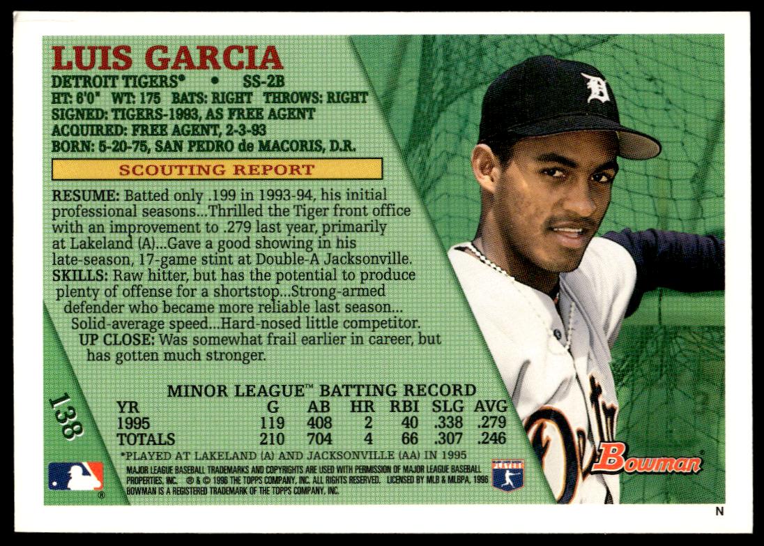 This Baseball card, from 1996 is part of the Bowman  card set. Luis Garcia is featured and has a card number of 138.
