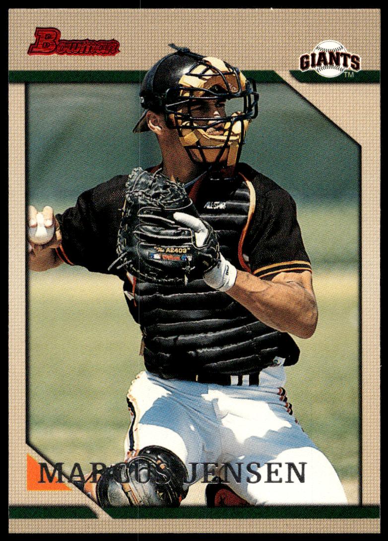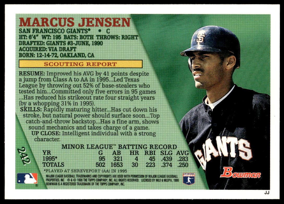 This Baseball card, from 1996 is part of the Bowman  card set. Marcus Jensen is featured and has a card number of 242.