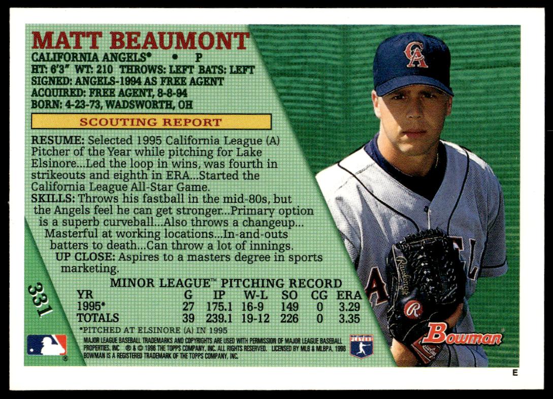 This Baseball card, from 1996 is part of the Bowman  card set. Matt Beaumont is featured and has a card number of 331.