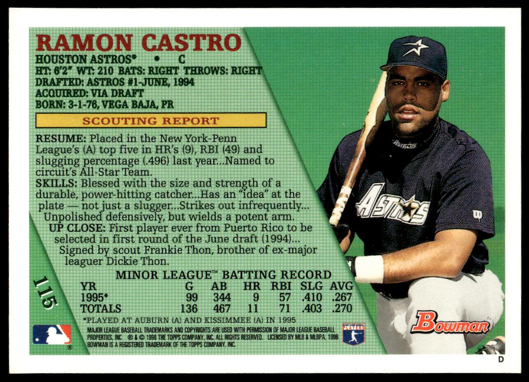 This Baseball card, from 1996 is part of the Bowman  card set. Ramon Castro is featured and has a card number of 115.