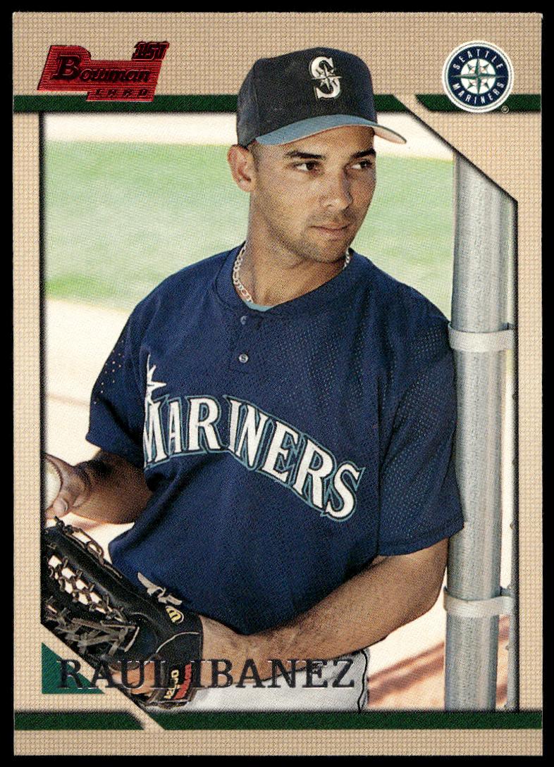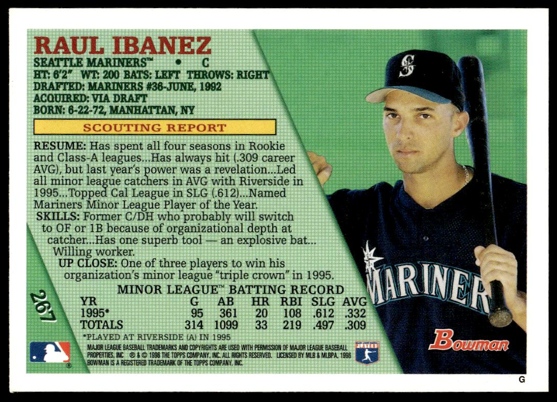 This Baseball card, from 1996 is part of the Bowman  card set. Raul Ibanez is featured and has a card number of 267.